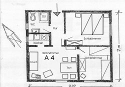 A4 für 2 Gäste ist unsere größte Ferienwohnung mit drei Räumen, einem Wohnzimmer, zwei Schlafzimmer, Pantry- Küche DU und WC.
